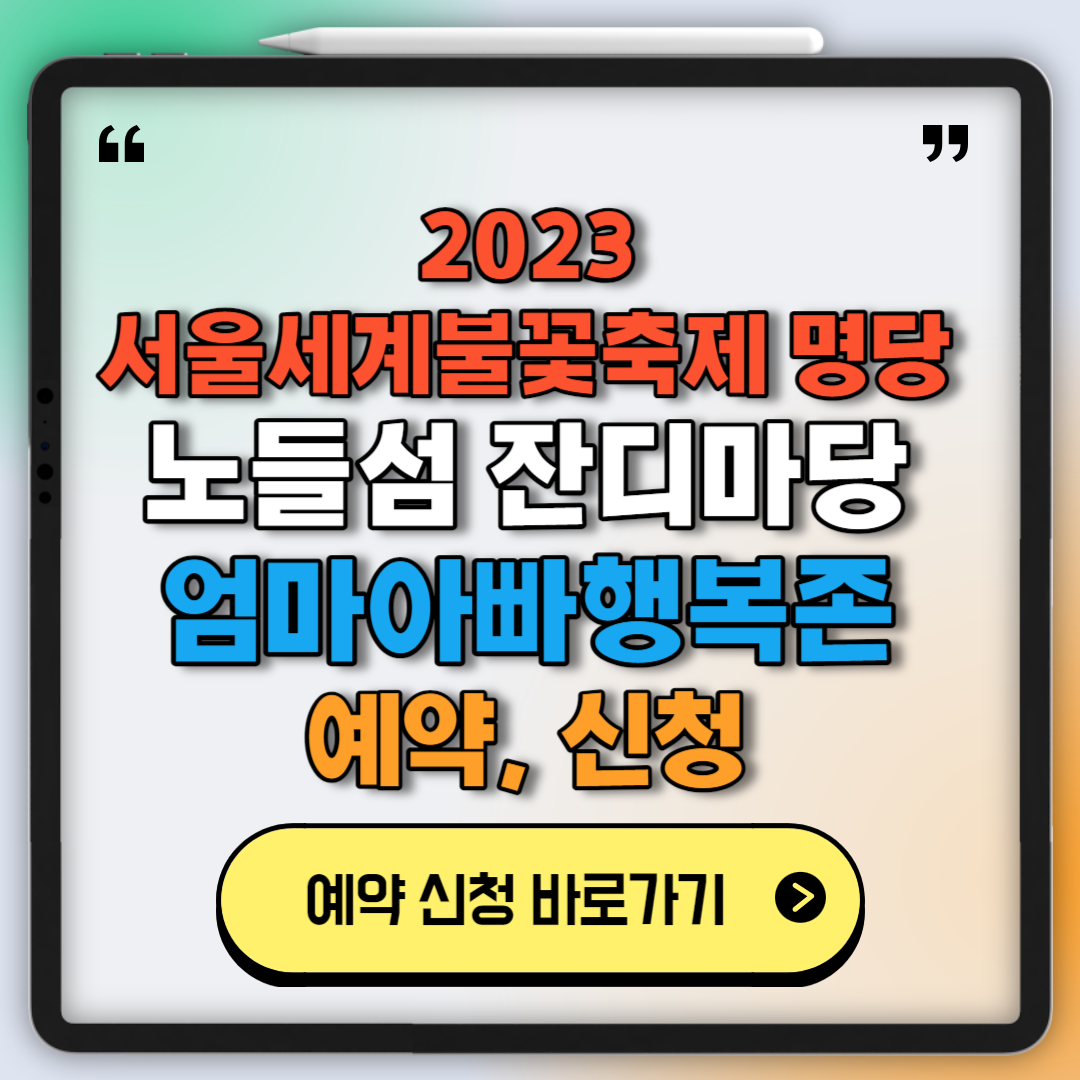 10월 7일에 열리는 '서울세계불꽃축제 2023'을 맞아 노들섬 잔디마당에 500석 규모의 가족 전용 관람 공간인 '엄마아빠행복존'을 예약 운영한다고 합니다. 노들섬은 여의도 한강공원과 가까워 매년 불꽃축제 관람 명소로 많은 사랑을 받는 곳입니다. 이런 좋은 자리에 어린 자녀가 있어 불꽃축제를 온전히 즐길 수 없었던 엄마, 아빠들을 위하여 온 가족이 쾌적하고 안전하게 불꽃축제를 관람할 수 있는 전용석운영한다고 합니다. 참여를 원하는 분은 9월 21일 오전 10부터 25일 오후 5시 까지 신청이 가능하다고 합니다. 추첨제로 운영되니 아래에서 우선 신청해 보시기 바랍니다.