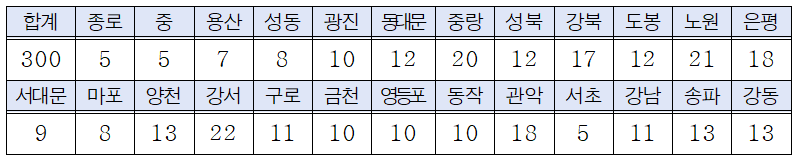 총 300명으로 아래의 표를 참고하시기 바랍니다.